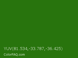 YUV 81.534,-33.787,-36.425 Color is a dark green color and the nearest color is Bilbao #327c14. Hex code #28740d and RGB value is rgb(40,116,13). In RGB color space, this color is composed of 16% red, 45% green, 5% blue, In CMYK color space, this color is composed of 66% cyan, 0% magenta, 89% yellow , 55% black , In HSL color space, this color has a hue angle of 104° , 80% saturation and 25% lightness.