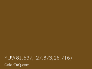 YUV 81.537,-27.873,26.716 Color is a dark orange color and the nearest color is Raw Umber #734a12. Hex code #704d19 and RGB value is rgb(112,77,25). In RGB color space, this color is composed of 44% red, 30% green, 10% blue, In CMYK color space, this color is composed of 0% cyan, 31% magenta, 78% yellow , 56% black , In HSL color space, this color has a hue angle of 36° , 64% saturation and 27% lightness.