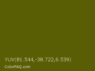 YUV 81.544,-38.722,6.539 Color is a very dark yellow color and the nearest color is Saratoga #555b10. Hex code #595d03 and RGB value is rgb(89,93,3). In RGB color space, this color is composed of 35% red, 36% green, 1% blue, In CMYK color space, this color is composed of 4% cyan, 0% magenta, 97% yellow , 64% black , In HSL color space, this color has a hue angle of 63° , 94% saturation and 19% lightness.