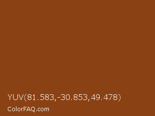 YUV 81.583,-30.853,49.478 Color is a normal orange color and the nearest color is Saddle Brown #8b4513. Hex code #8a4113 and RGB value is rgb(138,65,19). In RGB color space, this color is composed of 54% red, 25% green, 7% blue, In CMYK color space, this color is composed of 0% cyan, 53% magenta, 86% yellow , 46% black , In HSL color space, this color has a hue angle of 23° , 76% saturation and 31% lightness.