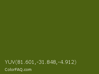 YUV 81.601,-31.848,-4.912 Color is a very dark lime color and the nearest color is Saratoga #555b10. Hex code #4c6111 and RGB value is rgb(76,97,17). In RGB color space, this color is composed of 30% red, 38% green, 7% blue, In CMYK color space, this color is composed of 22% cyan, 0% magenta, 82% yellow , 62% black , In HSL color space, this color has a hue angle of 76° , 70% saturation and 22% lightness.