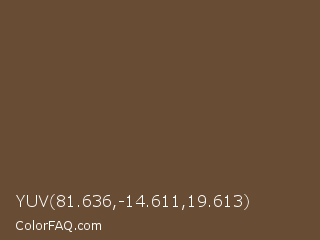YUV 81.636,-14.611,19.613 Color is a normal orange color and the nearest color is Shingle Fawn #6b4e31. Hex code #684c34 and RGB value is rgb(104,76,52). In RGB color space, this color is composed of 41% red, 30% green, 20% blue, In CMYK color space, this color is composed of 0% cyan, 27% magenta, 50% yellow , 59% black , In HSL color space, this color has a hue angle of 28° , 33% saturation and 31% lightness.