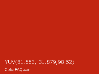 YUV 81.663,-31.879,98.52 Color is a normal red color and the nearest color is Thunderbird #c02b18. Hex code #c22511 and RGB value is rgb(194,37,17). In RGB color space, this color is composed of 76% red, 15% green, 7% blue, In CMYK color space, this color is composed of 0% cyan, 81% magenta, 91% yellow , 24% black , In HSL color space, this color has a hue angle of 7° , 84% saturation and 41% lightness.