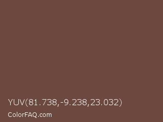 YUV 81.738,-9.238,23.032 Color is a normal red color and the nearest color is Roast Coffee #704241. Hex code #6c483f and RGB value is rgb(108,72,63). In RGB color space, this color is composed of 42% red, 28% green, 25% blue, In CMYK color space, this color is composed of 0% cyan, 33% magenta, 42% yellow , 58% black , In HSL color space, this color has a hue angle of 12° , 26% saturation and 34% lightness.