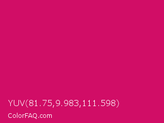 YUV 81.75,9.983,111.598 Color is a normal rose color and the nearest color is Dogwood Rose #d71868. Hex code #d10d66 and RGB value is rgb(209,13,102). In RGB color space, this color is composed of 82% red, 5% green, 40% blue, In CMYK color space, this color is composed of 0% cyan, 94% magenta, 51% yellow , 18% black , In HSL color space, this color has a hue angle of 333° , 88% saturation and 44% lightness.