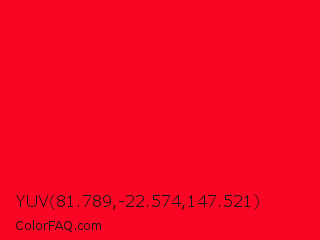YUV 81.789,-22.574,147.521 Color is a normal red color and the nearest color is Ruddy #ff0028. Hex code #fa0524 and RGB value is rgb(250,5,36). In RGB color space, this color is composed of 98% red, 2% green, 14% blue, In CMYK color space, this color is composed of 0% cyan, 98% magenta, 86% yellow , 2% black , In HSL color space, this color has a hue angle of 352° , 96% saturation and 50% lightness.