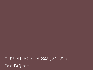 YUV 81.807,-3.849,21.217 Color is a normal red color and the nearest color is Rose Ebony #674846. Hex code #6a474a and RGB value is rgb(106,71,74). In RGB color space, this color is composed of 42% red, 28% green, 29% blue, In CMYK color space, this color is composed of 0% cyan, 33% magenta, 30% yellow , 58% black , In HSL color space, this color has a hue angle of 355° , 20% saturation and 35% lightness.