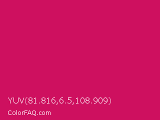 YUV 81.816,6.5,108.909 Color is a normal rose color and the nearest color is Dogwood Rose #d71868. Hex code #ce105f and RGB value is rgb(206,16,95). In RGB color space, this color is composed of 81% red, 6% green, 37% blue, In CMYK color space, this color is composed of 0% cyan, 92% magenta, 54% yellow , 19% black , In HSL color space, this color has a hue angle of 335° , 86% saturation and 44% lightness.