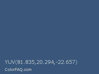 YUV 81.835,20.294,-22.657 Color is a normal blue color and the nearest color is East Bay #414c7d. Hex code #38577b and RGB value is rgb(56,87,123). In RGB color space, this color is composed of 22% red, 34% green, 48% blue, In CMYK color space, this color is composed of 54% cyan, 29% magenta, 0% yellow , 52% black , In HSL color space, this color has a hue angle of 212° , 37% saturation and 35% lightness.