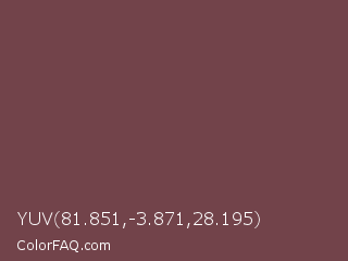 YUV 81.851,-3.871,28.195 Color is a normal red color and the nearest color is Roast Coffee #704241. Hex code #72434a and RGB value is rgb(114,67,74). In RGB color space, this color is composed of 45% red, 26% green, 29% blue, In CMYK color space, this color is composed of 0% cyan, 41% magenta, 35% yellow , 55% black , In HSL color space, this color has a hue angle of 351° , 26% saturation and 35% lightness.
