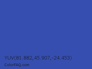 YUV 81.882,45.907,-24.453 Color is a normal blue color and the nearest color is Violet Blue #324ab2. Hex code #364eaf and RGB value is rgb(54,78,175). In RGB color space, this color is composed of 21% red, 31% green, 69% blue, In CMYK color space, this color is composed of 69% cyan, 55% magenta, 0% yellow , 31% black , In HSL color space, this color has a hue angle of 228° , 53% saturation and 45% lightness.