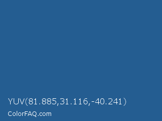 YUV 81.885,31.116,-40.241 Color is a normal blue color and the nearest color is B Dazzled Blue #2e5894. Hex code #245d91 and RGB value is rgb(36,93,145). In RGB color space, this color is composed of 14% red, 36% green, 57% blue, In CMYK color space, this color is composed of 75% cyan, 36% magenta, 0% yellow , 43% black , In HSL color space, this color has a hue angle of 209° , 60% saturation and 35% lightness.