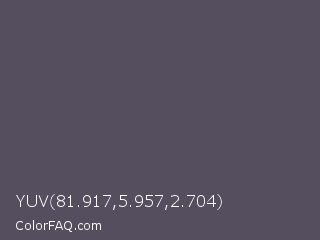 YUV 81.917,5.957,2.704 Color is a normal violet color and the nearest color is Scarpa Flow #585562. Hex code #554e5e and RGB value is rgb(85,78,94). In RGB color space, this color is composed of 33% red, 31% green, 37% blue, In CMYK color space, this color is composed of 10% cyan, 17% magenta, 0% yellow , 63% black , In HSL color space, this color has a hue angle of 266° , 9% saturation and 34% lightness.