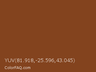 YUV 81.918,-25.596,43.045 Color is a normal orange color and the nearest color is Russet #80461b. Hex code #83431e and RGB value is rgb(131,67,30). In RGB color space, this color is composed of 51% red, 26% green, 12% blue, In CMYK color space, this color is composed of 0% cyan, 49% magenta, 77% yellow , 49% black , In HSL color space, this color has a hue angle of 22° , 63% saturation and 32% lightness.