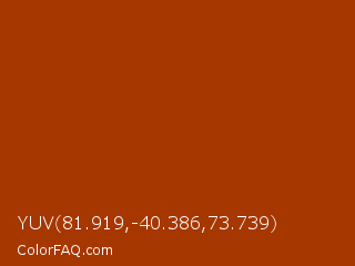 YUV 81.919,-40.386,73.739 Color is a normal orange color and the nearest color is Fire #aa4203. Hex code #a63700 and RGB value is rgb(166,55,-0). In RGB color space, this color is composed of 65% red, 22% green, 0% blue, In CMYK color space, this color is composed of 0% cyan, 67% magenta, 100% yellow , 35% black , In HSL color space, this color has a hue angle of 20° , 100% saturation and 33% lightness.