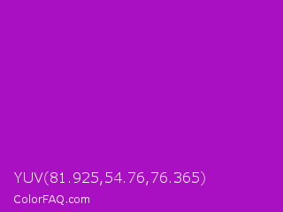 YUV 81.925,54.76,76.365 Color is a normal magenta color and the nearest color is Heliotrope Magenta #aa00bb. Hex code #a910c1 and RGB value is rgb(169,16,193). In RGB color space, this color is composed of 66% red, 6% green, 76% blue, In CMYK color space, this color is composed of 12% cyan, 92% magenta, 0% yellow , 24% black , In HSL color space, this color has a hue angle of 292° , 85% saturation and 41% lightness.