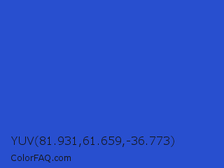 YUV 81.931,61.659,-36.773 Color is a normal blue color and the nearest color is New Car #214fc6. Hex code #284fcf and RGB value is rgb(40,79,207). In RGB color space, this color is composed of 16% red, 31% green, 81% blue, In CMYK color space, this color is composed of 81% cyan, 62% magenta, 0% yellow , 19% black , In HSL color space, this color has a hue angle of 226° , 68% saturation and 48% lightness.