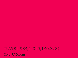 YUV 81.934,1.019,140.378 Color is a normal rose color and the nearest color is Folly #ff004f. Hex code #f20054 and RGB value is rgb(242,-0,84). In RGB color space, this color is composed of 95% red, 0% green, 33% blue, In CMYK color space, this color is composed of 0% cyan, 100% magenta, 65% yellow , 5% black , In HSL color space, this color has a hue angle of 339° , 100% saturation and 47% lightness.