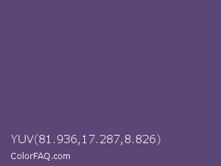 YUV 81.936,17.287,8.826 Color is a normal violet color and the nearest color is Cyber Grape #58427c. Hex code #5c4675 and RGB value is rgb(92,70,117). In RGB color space, this color is composed of 36% red, 27% green, 46% blue, In CMYK color space, this color is composed of 21% cyan, 40% magenta, 0% yellow , 54% black , In HSL color space, this color has a hue angle of 268° , 25% saturation and 37% lightness.