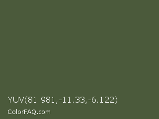 YUV 81.981,-11.33,-6.122 Color is a dark green color and the nearest color is Gray Asparagus #465945. Hex code #4b5a3b and RGB value is rgb(75,90,59). In RGB color space, this color is composed of 29% red, 35% green, 23% blue, In CMYK color space, this color is composed of 17% cyan, 0% magenta, 34% yellow , 65% black , In HSL color space, this color has a hue angle of 89° , 21% saturation and 29% lightness.
