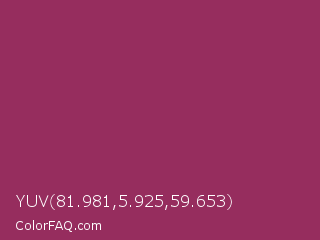 YUV 81.981,5.925,59.653 Color is a normal rose color and the nearest color is Amaranth Deep Purple #9f2b68. Hex code #962d5e and RGB value is rgb(150,45,94). In RGB color space, this color is composed of 59% red, 18% green, 37% blue, In CMYK color space, this color is composed of 0% cyan, 70% magenta, 37% yellow , 41% black , In HSL color space, this color has a hue angle of 332° , 54% saturation and 38% lightness.