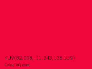 YUV 82.008,-11.343,138.559 Color is a normal red color and the nearest color is Red Munsell #f2003c. Hex code #f0063b and RGB value is rgb(240,6,59). In RGB color space, this color is composed of 94% red, 2% green, 23% blue, In CMYK color space, this color is composed of 0% cyan, 98% magenta, 75% yellow , 6% black , In HSL color space, this color has a hue angle of 346° , 95% saturation and 48% lightness.