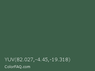 YUV 82.027,-4.45,-19.318 Color is a dark green color and the nearest color is Mineral Green #3f5d53. Hex code #3c5f49 and RGB value is rgb(60,95,73). In RGB color space, this color is composed of 24% red, 37% green, 29% blue, In CMYK color space, this color is composed of 37% cyan, 0% magenta, 23% yellow , 63% black , In HSL color space, this color has a hue angle of 142° , 23% saturation and 30% lightness.