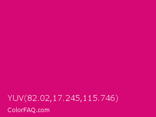 YUV 82.02,17.245,115.746 Color is a normal rose color and the nearest color is Red Purple #e40078. Hex code #d60875 and RGB value is rgb(214,8,117). In RGB color space, this color is composed of 84% red, 3% green, 46% blue, In CMYK color space, this color is composed of 0% cyan, 96% magenta, 45% yellow , 16% black , In HSL color space, this color has a hue angle of 328° , 93% saturation and 44% lightness.