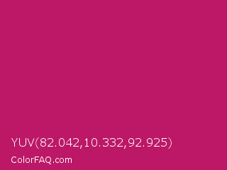 YUV 82.042,10.332,92.925 Color is a normal rose color and the nearest color is Rose Red #c21e56. Hex code #bc1867 and RGB value is rgb(188,24,103). In RGB color space, this color is composed of 74% red, 9% green, 40% blue, In CMYK color space, this color is composed of 0% cyan, 87% magenta, 45% yellow , 26% black , In HSL color space, this color has a hue angle of 331° , 77% saturation and 42% lightness.