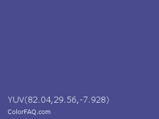 YUV 82.04,29.56,-7.928 Color is a normal blue color and the nearest color is Victoria #534491. Hex code #494b8e and RGB value is rgb(73,75,142). In RGB color space, this color is composed of 29% red, 29% green, 56% blue, In CMYK color space, this color is composed of 49% cyan, 47% magenta, 0% yellow , 44% black , In HSL color space, this color has a hue angle of 238° , 32% saturation and 42% lightness.