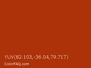 YUV 82.103,-36.04,79.717 Color is a normal color and the nearest color is Fire #aa4203. Hex code #ad3209 and RGB value is rgb(173,50,9). In RGB color space, this color is composed of 68% red, 20% green, 4% blue, In CMYK color space, this color is composed of 0% cyan, 71% magenta, 95% yellow , 32% black , In HSL color space, this color has a hue angle of 15° , 90% saturation and 36% lightness.