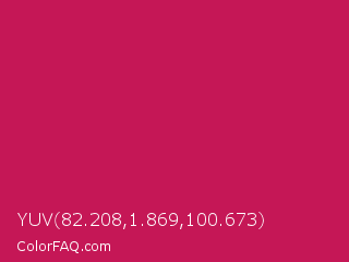 YUV 82.208,1.869,100.673 Color is a normal rose color and the nearest color is Rose Red #c21e56. Hex code #c51756 and RGB value is rgb(197,23,86). In RGB color space, this color is composed of 77% red, 9% green, 34% blue, In CMYK color space, this color is composed of 0% cyan, 88% magenta, 56% yellow , 23% black , In HSL color space, this color has a hue angle of 338° , 79% saturation and 43% lightness.