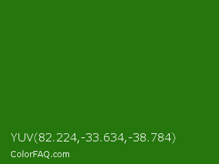 YUV 82.224,-33.634,-38.784 Color is a dark green color and the nearest color is Bilbao #327c14. Hex code #26760e and RGB value is rgb(38,118,14). In RGB color space, this color is composed of 15% red, 46% green, 5% blue, In CMYK color space, this color is composed of 68% cyan, 0% magenta, 88% yellow , 54% black , In HSL color space, this color has a hue angle of 106° , 79% saturation and 26% lightness.