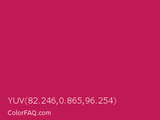 YUV 82.246,0.865,96.254 Color is a normal rose color and the nearest color is Rose Red #c21e56. Hex code #c01a54 and RGB value is rgb(192,26,84). In RGB color space, this color is composed of 75% red, 10% green, 33% blue, In CMYK color space, this color is composed of 0% cyan, 86% magenta, 56% yellow , 25% black , In HSL color space, this color has a hue angle of 339° , 76% saturation and 43% lightness.