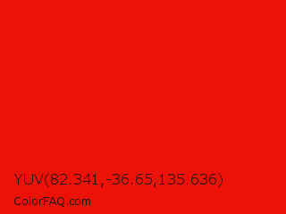 YUV 82.341,-36.65,135.636 Color is a normal red color and the nearest color is KU Crimson #e8000d. Hex code #ed1208 and RGB value is rgb(237,18,8). In RGB color space, this color is composed of 93% red, 7% green, 3% blue, In CMYK color space, this color is composed of 0% cyan, 92% magenta, 97% yellow , 7% black , In HSL color space, this color has a hue angle of 3° , 93% saturation and 48% lightness.