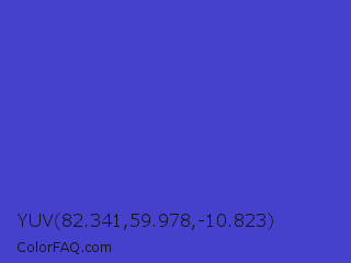 YUV 82.341,59.978,-10.823 Color is a normal indigo color and the nearest color is Iris #5a4fcf. Hex code #4641cc and RGB value is rgb(70,65,204). In RGB color space, this color is composed of 27% red, 25% green, 80% blue, In CMYK color space, this color is composed of 66% cyan, 68% magenta, 0% yellow , 20% black , In HSL color space, this color has a hue angle of 242° , 58% saturation and 53% lightness.