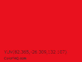 YUV 82.365,-26.309,132.107 Color is a normal red color and the nearest color is Red Pigment #ed1c24. Hex code #e9101d and RGB value is rgb(233,16,29). In RGB color space, this color is composed of 91% red, 6% green, 11% blue, In CMYK color space, this color is composed of 0% cyan, 93% magenta, 88% yellow , 9% black , In HSL color space, this color has a hue angle of 356° , 87% saturation and 49% lightness.