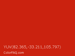 YUV 82.365,-33.211,105.797 Color is a normal red color and the nearest color is Thunderbird #c02b18. Hex code #cb220f and RGB value is rgb(203,34,15). In RGB color space, this color is composed of 80% red, 13% green, 6% blue, In CMYK color space, this color is composed of 0% cyan, 83% magenta, 93% yellow , 20% black , In HSL color space, this color has a hue angle of 6° , 86% saturation and 43% lightness.