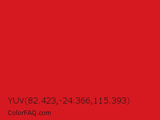 YUV 82.423,-24.366,115.393 Color is a normal red color and the nearest color is Maximum Red #d92121. Hex code #d61921 and RGB value is rgb(214,25,33). In RGB color space, this color is composed of 84% red, 10% green, 13% blue, In CMYK color space, this color is composed of 0% cyan, 88% magenta, 85% yellow , 16% black , In HSL color space, this color has a hue angle of 357° , 79% saturation and 47% lightness.