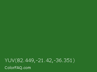 YUV 82.449,-21.42,-36.351 Color is a dark green color and the nearest color is Mughal Green #306030. Hex code #297027 and RGB value is rgb(41,112,39). In RGB color space, this color is composed of 16% red, 44% green, 15% blue, In CMYK color space, this color is composed of 63% cyan, 0% magenta, 65% yellow , 56% black , In HSL color space, this color has a hue angle of 118° , 48% saturation and 30% lightness.