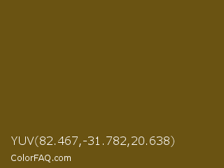 YUV 82.467,-31.782,20.638 Color is a dark orange color and the nearest color is West Coast #625119. Hex code #6a5312 and RGB value is rgb(106,83,18). In RGB color space, this color is composed of 42% red, 33% green, 7% blue, In CMYK color space, this color is composed of 0% cyan, 22% magenta, 83% yellow , 58% black , In HSL color space, this color has a hue angle of 44° , 71% saturation and 24% lightness.