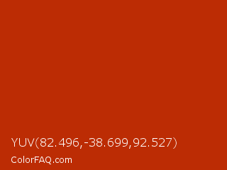 YUV 82.496,-38.699,92.527 Color is a normal red color and the nearest color is Thunderbird #c02b18. Hex code #bc2c04 and RGB value is rgb(188,44,4). In RGB color space, this color is composed of 74% red, 17% green, 2% blue, In CMYK color space, this color is composed of 0% cyan, 77% magenta, 98% yellow , 26% black , In HSL color space, this color has a hue angle of 13° , 96% saturation and 38% lightness.