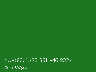 YUV 82.4,-23.861,-46.832 Color is a dark green color and the nearest color is Forest Green #228b22. Hex code #1d7722 and RGB value is rgb(29,119,34). In RGB color space, this color is composed of 11% red, 47% green, 13% blue, In CMYK color space, this color is composed of 76% cyan, 0% magenta, 71% yellow , 53% black , In HSL color space, this color has a hue angle of 123° , 61% saturation and 29% lightness.