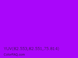 YUV 82.553,82.551,75.814 Color is a normal purple color and the nearest color is Vivid Violet #9f00ff. Hex code #a906fa and RGB value is rgb(169,6,250). In RGB color space, this color is composed of 66% red, 2% green, 98% blue, In CMYK color space, this color is composed of 32% cyan, 98% magenta, 0% yellow , 2% black , In HSL color space, this color has a hue angle of 280° , 96% saturation and 50% lightness.