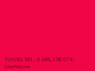 YUV 82.561,-6.686,138.074 Color is a normal rose color and the nearest color is Red Ribbon #ed0a3f. Hex code #f00545 and RGB value is rgb(240,5,69). In RGB color space, this color is composed of 94% red, 2% green, 27% blue, In CMYK color space, this color is composed of 0% cyan, 98% magenta, 71% yellow , 6% black , In HSL color space, this color has a hue angle of 344° , 96% saturation and 48% lightness.