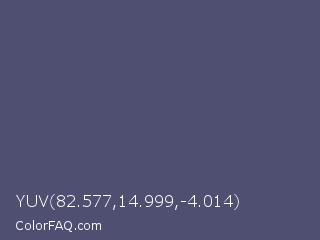 YUV 82.577,14.999,-4.014 Color is a normal blue color and the nearest color is Independence #4c516d. Hex code #4e4f71 and RGB value is rgb(78,79,113). In RGB color space, this color is composed of 31% red, 31% green, 44% blue, In CMYK color space, this color is composed of 31% cyan, 30% magenta, 0% yellow , 56% black , In HSL color space, this color has a hue angle of 238° , 18% saturation and 37% lightness.
