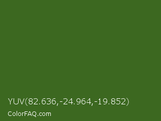 YUV 82.636,-24.964,-19.852 Color is a dark green color and the nearest color is Dell #396413. Hex code #3c6820 and RGB value is rgb(60,104,32). In RGB color space, this color is composed of 24% red, 41% green, 13% blue, In CMYK color space, this color is composed of 42% cyan, 0% magenta, 69% yellow , 59% black , In HSL color space, this color has a hue angle of 97° , 53% saturation and 27% lightness.