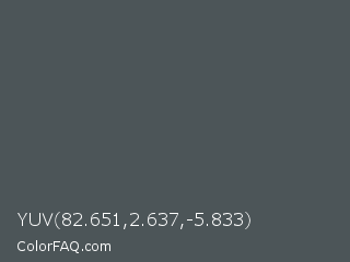 YUV 82.651,2.637,-5.833 Color is a normal blue color and the nearest color is Abbey #4c4f56. Hex code #4c5558 and RGB value is rgb(76,85,88). In RGB color space, this color is composed of 30% red, 33% green, 35% blue, In CMYK color space, this color is composed of 14% cyan, 3% magenta, 0% yellow , 65% black , In HSL color space, this color has a hue angle of 195° , 7% saturation and 32% lightness.