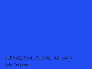 YUV 82.654,78.558,-43.547 Color is a normal blue color and the nearest color is Palatinate Blue #273be2. Hex code #214df2 and RGB value is rgb(33,77,242). In RGB color space, this color is composed of 13% red, 30% green, 95% blue, In CMYK color space, this color is composed of 86% cyan, 68% magenta, 0% yellow , 5% black , In HSL color space, this color has a hue angle of 227° , 89% saturation and 54% lightness.