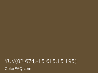 YUV 82.674,-15.615,15.195 Color is a dark orange color and the nearest color is Shingle Fawn #6b4e31. Hex code #645033 and RGB value is rgb(100,80,51). In RGB color space, this color is composed of 39% red, 31% green, 20% blue, In CMYK color space, this color is composed of 0% cyan, 20% magenta, 49% yellow , 61% black , In HSL color space, this color has a hue angle of 36° , 32% saturation and 30% lightness.